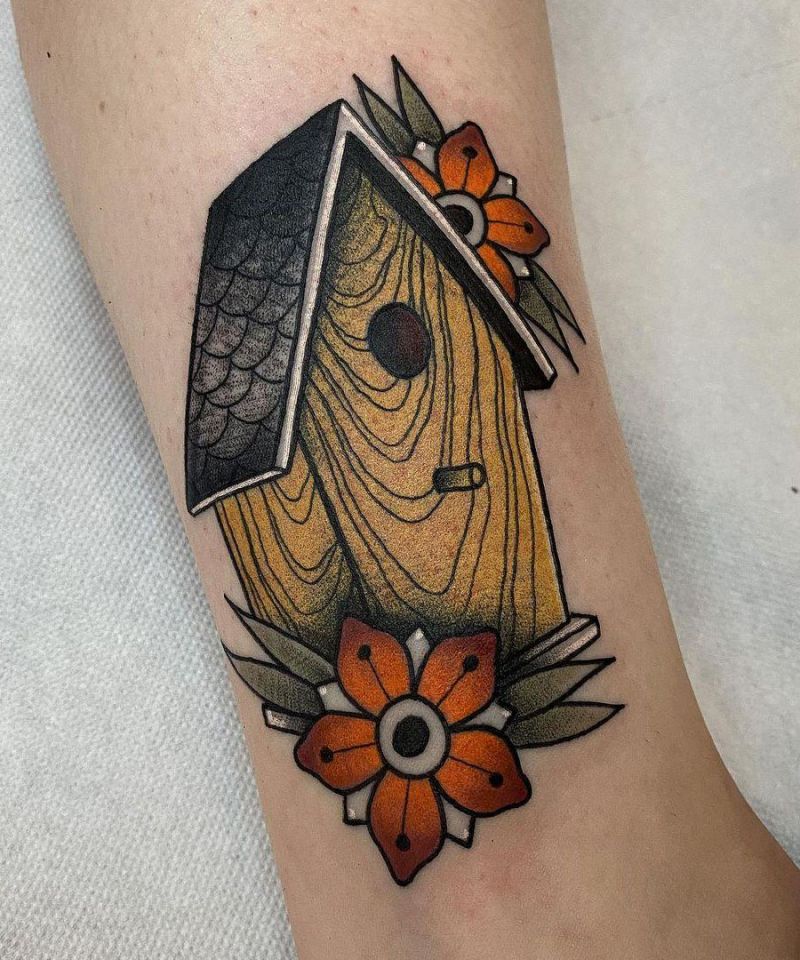 The meaning of bird house tattoo is warmth, stability and a sense of belonging. Provide a comfortable bird house for birds flying around outside, encourage them to come back every year, and add a bit of bird singing and flower fragrance to your door or backyard.