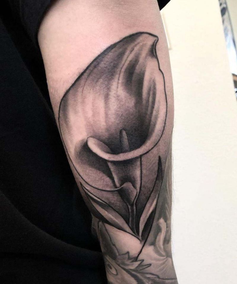 Calla lily tattoo means noble character. When the Calla lily plant blooms, its stem is upright and looks elegant and beautiful. It is suitable to give it to friends with noble character and express the pure friendship between friends.