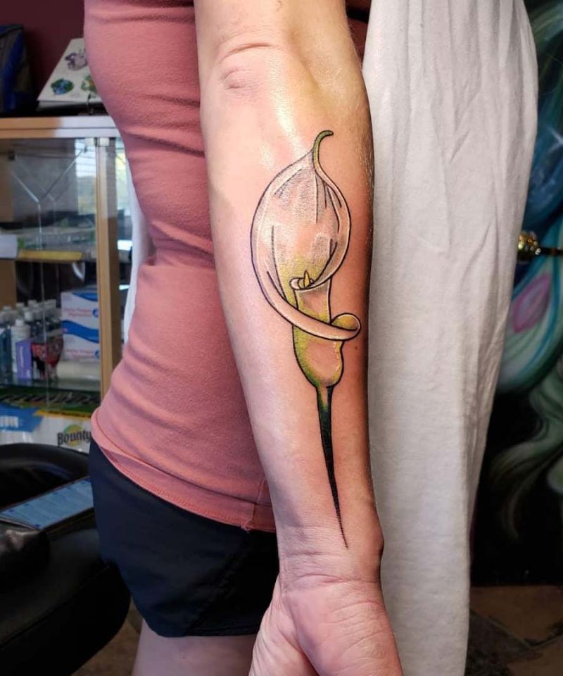 The meaning of Calla lily tattoo is good luck. Calla lily is very suitable for potted culture in the living room or ground planting in the courtyard. During the flowering period, the flower color of the plant is light and elegant, and the leaves stretch, giving people a fresh, natural, warm and comfortable feeling. At the same time, it can also bring peace and auspiciousness.