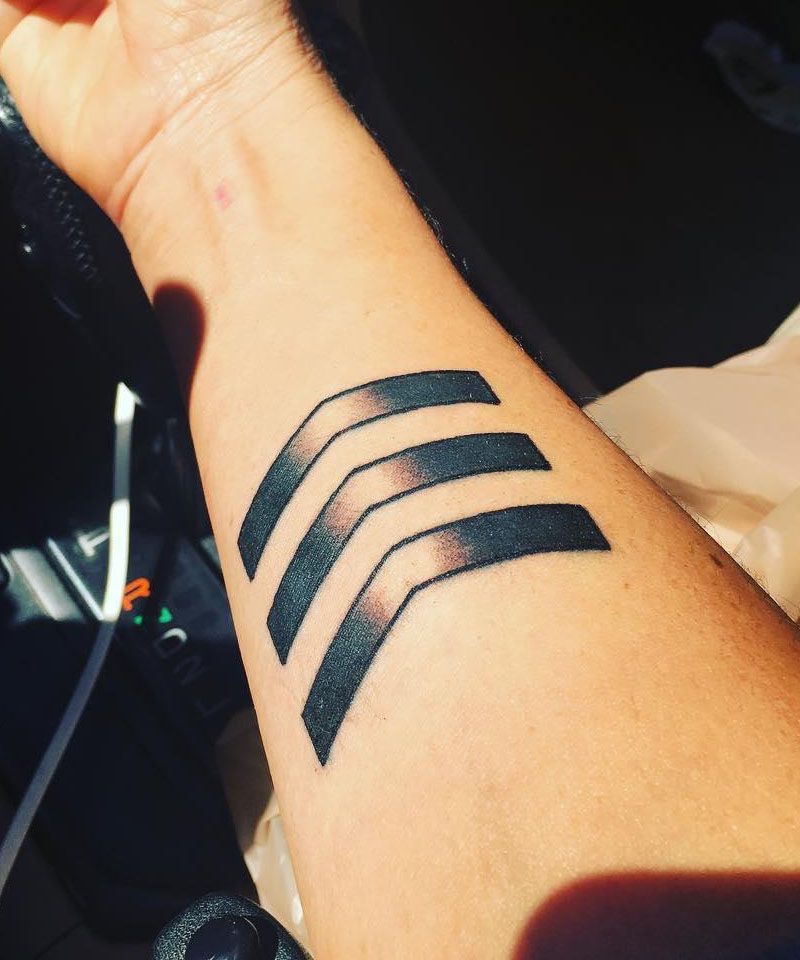 In tattoos, the chevron symbol is one of the most popular patterns. The chevron and its number in most cases represent the rank of a particular member of the army or other armed forces. A chevron sign indicates that the person is a soldier or corporal. Two chevron signs indicate that this person is a corporal. Three chevrons indicate that they are a sergeant, and four chevrons indicate that they are a higher-level sergeant.