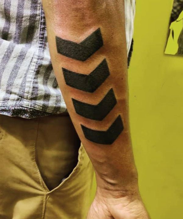 In tattoos, the chevron symbol is one of the most popular patterns. The chevron and its number in most cases represent the rank of a particular member of the army or other armed forces. A chevron sign indicates that the person is a soldier or corporal. Two chevron signs indicate that this person is a corporal. Three chevrons indicate that they are a sergeant, and four chevrons indicate that they are a higher-level sergeant.