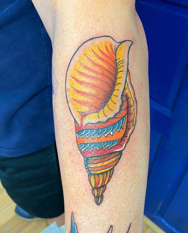 Conch is a kind of marine mollusk living in tropical waters, with a spiral shell and a cone at one end. The shell of conch is mainly used to wrap the body, which is part of the skeletal system, but also used to protect the body from the killing of predators and body abrasion. Conch tattoos are not common in the tattoo industry. They only appear on tattoos who are curious about the ocean world. All kinds of conch ink on the skin surface is also very beautiful. It is a very creative design.
