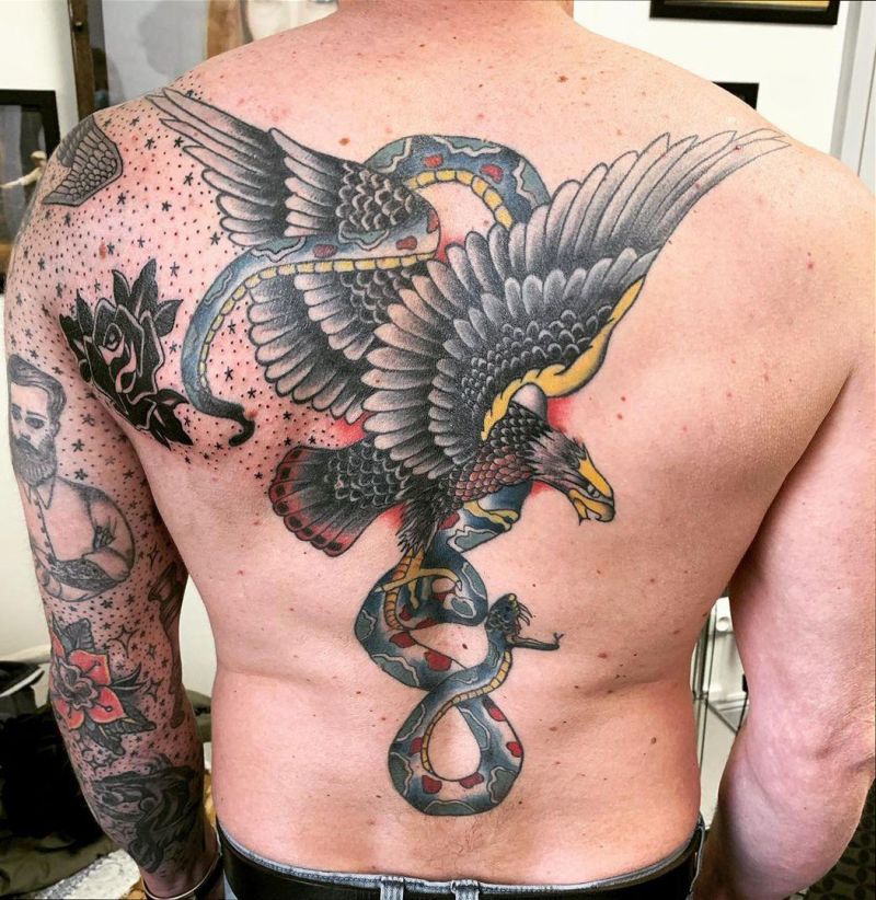 Snakes are life on earth. And the eagle is flying in the sky. The tattoo pattern of Eagle catching snake means that potential is inevitable. The eagle has a high will and a prosperous official career. The snake represents the little dragon, which means to benefit from the wind and have the virtue of a gentleman.