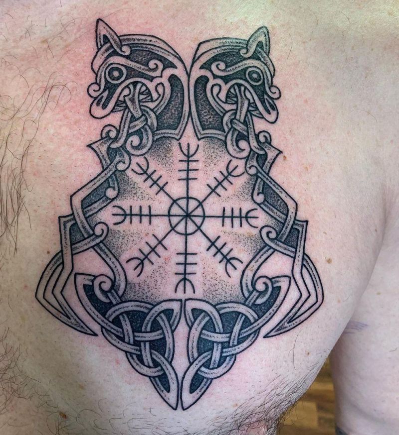 The helm of awe is a very popular magic Rune in Ancient Northern Europe. It often appears in various Sakya stories. For example, Sigurd, the Dragon Slayer, got it from his treasure when he defeated the poisonous dragon Fafnir. The effect of this rune is probably to protect the user and bring fear and frustration to the enemy. The word helm means protection and coverage in Old English and old Germanic. The modern helmet comes from this word.