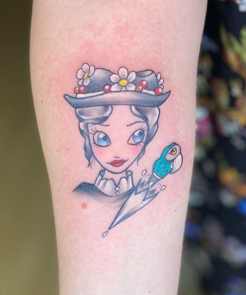 Mary Poppins tattoo means fantastic ideas and happy childhood. There is such a well-known Magic Nanny in Britain: she floats slowly from the air with a big umbrella, which makes naughty children polite and obedient, and makes parents who are immersed in their career learn to appreciate their children - she is the famous Mary Poppins.