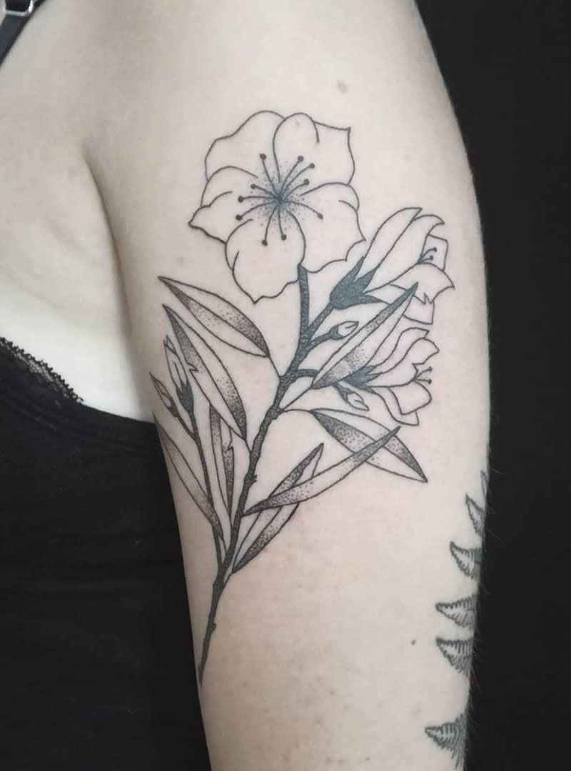 Oleander tattoo symbolizes unswerving love. Oleander is a very beautiful flower. There are many legends about oleander among the people. Oleander can be a symbol of unswerving love, a symbol of true love is not affected by other factors. Oleander tattoo means a beautiful and harmonious family. Oleander can also symbolize a beautiful and harmonious family, implying a kind and friendly family relationship and expressing family affection.