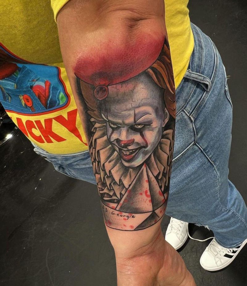 The meaning of Pennywise tattoo is a terrible devil. Pennywise is the main villain in Stephen King's famous horror novel IT and the adapted film and television work the clown's soul. Monsters of unknown origin usually appear as clowns. They have a ferocious face, yellow pupils and thick oil paint, which make people shudder. They are by no means good, but enjoy killing children. Children are the main targets of his attacks.