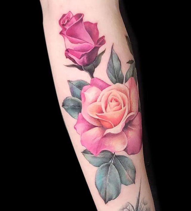 Pink Rose Tattoo means romantic warmth and sweetness. Rose is a very romantic flower. Many young people choose rose when they express their love. Roses of different colors have different meanings. Pink roses are very popular flowers for girls.