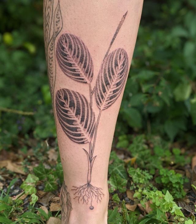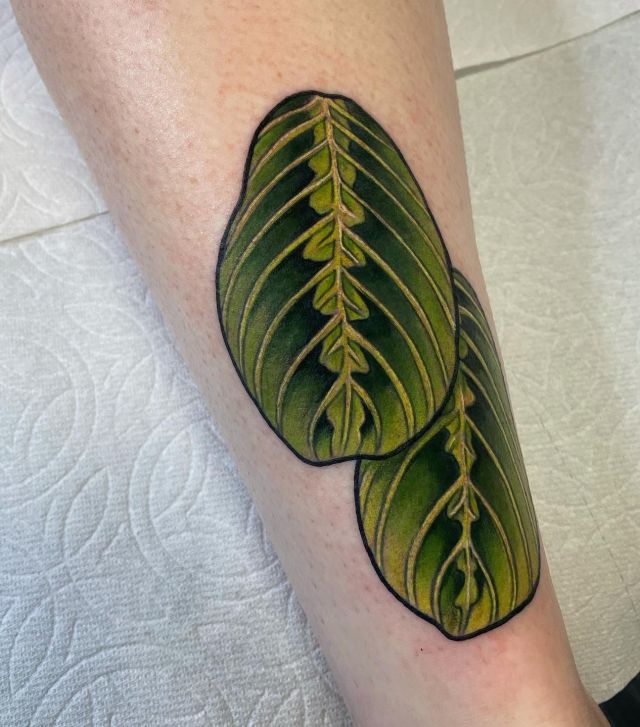 Two Prayer Plant Leaves Tattoo on lower Leg