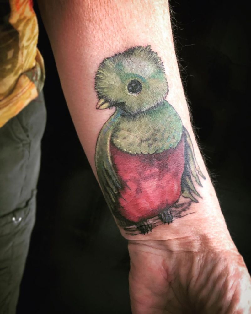 Quetzal is a very bright bird. Except for the dark red on the chest and abdomen, most of its body shows bright metallic green or blue. Male Quetzal have a unique cluster of golden yellow feathers. They have a crown on their head. They grow very long and can grow to one meter long. Although females don't grow that long, their color is similar to that of males, and their feathers are not so bright. Crimson breasts are darker, even gray, with gray or bronze heads and green edges. Like other members of the cuckoo family, Quetzal's feet are unique. Each foot has two forward toes and two backward toes to help Quetzal perch in high trees.