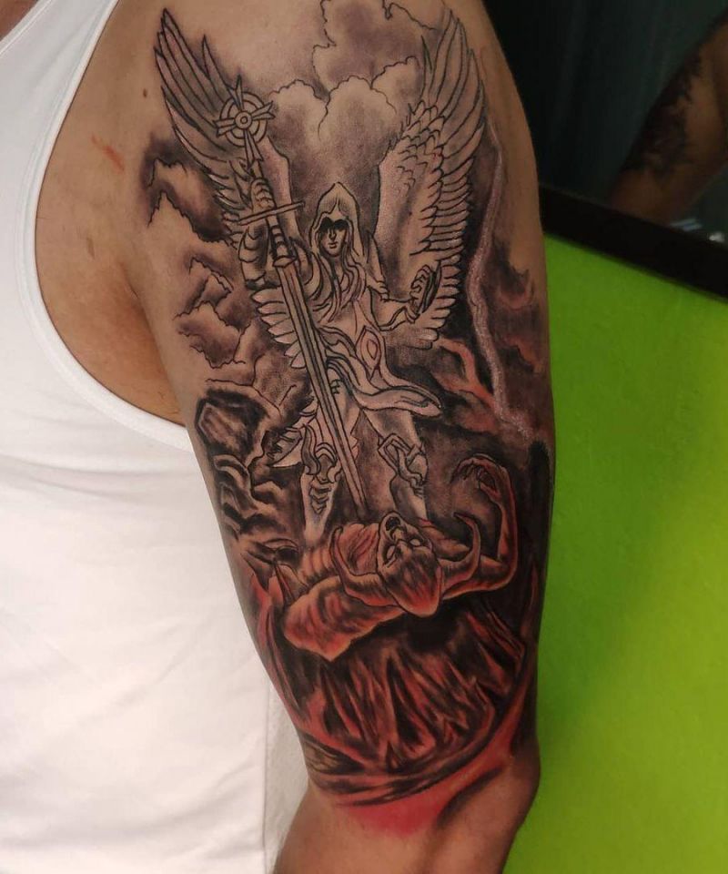 According to the Bible, in the seven day war with Satan, Michael fought against God's opponents and finally defeated him. In Christian Paintings and sculptures, Michael often fights with the dragon with long blond hair and holding a Red Cross (or Red Cross sword), standing on the dragon or becoming friends with the dragon. The Dragon here is Satan.