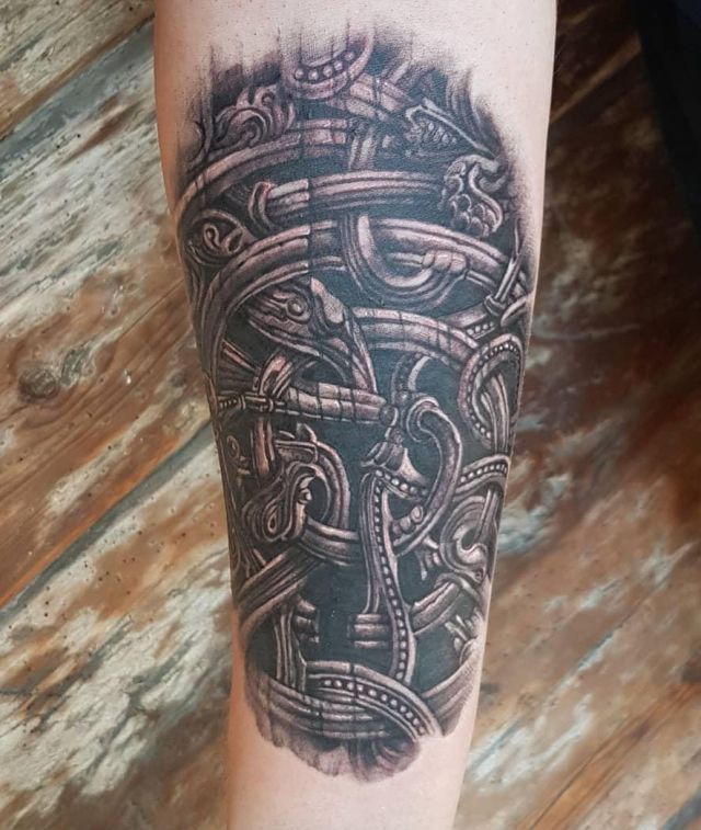 Unique Wood Carving Tattoo on Arm